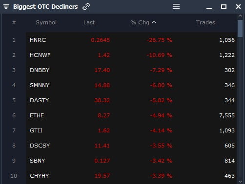 HNRC, HCNWF, DNBBY, SMNNY, DASTY, ETHE, GTII, DSCSY, SBNY, CHYHY
