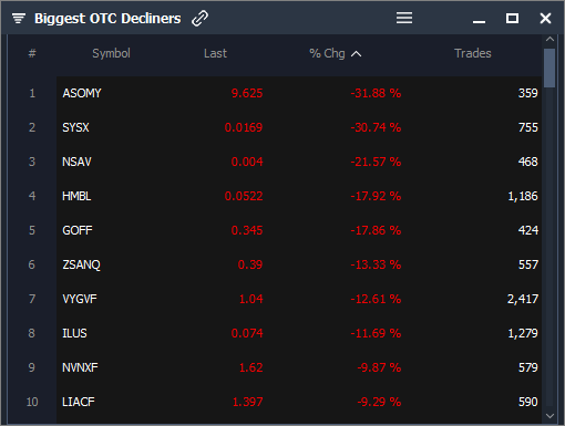 ASOMY, SYSX, NSAV, HMBL, GOFF, ZSANQ, VYGVF, ILUS, NVNXF, LIACF